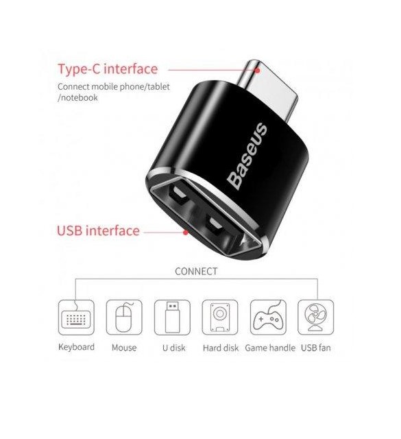 Baseus Adapter USB-C to USB Female Black (CATOTG-01) - це мініатюрний адаптер, який дозволяє заряджати і синхронізувати мобільні гаджети з ПК або ноутбуками, що мають інтерфейс USB тип C.