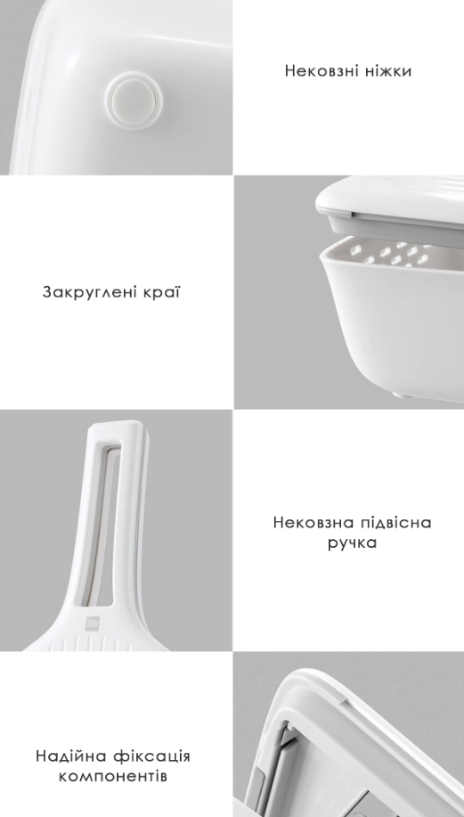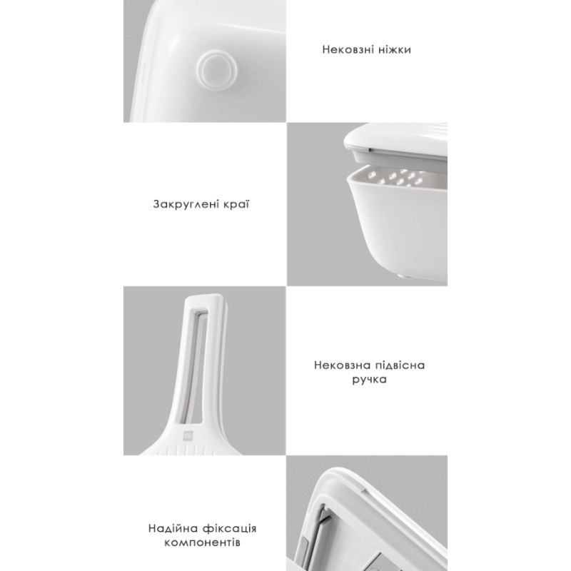 Корпус терки зі змінними насадками виготовлений з АБС-пластику, який має корозійну стійкість, термостійкість і стійкість до деформацій. Виріб простий у використанні, кожен модуль можна розібрати та почистити, що зручно та гігієнічно.