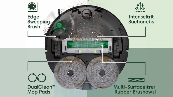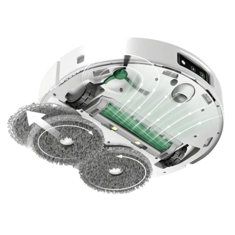 Висока ефективність прибирання досягається за рахунок чотирьох основних модулів Roomba 405. Бічна щітка відповідає за збирання сміття вздовж стін та плінтусів. Нижня щітка відправляє сміття у бак і має захист від намотування волосся. Потужний двигун, що всмоктує, збирає пил і надійно утримує його в сміттєвому баку, а миючі мопи завершують очищення, залишаючи за роботом чисту і злегка вологу підлогу.