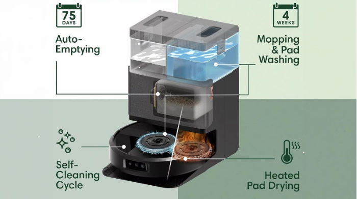 Станція повного самообслуговування виконує очищення бака для сміття і прання миючих мопів, а після закінчення циклу прибирання сушить їх і виконує зарядку робота. Сушіння мопів виконується гарячим повітрям. Робот здатний виконувати кілька прибирань автономно без участі. Обслуговування бази вимагає зміну мішка для сміття приблизно 1 раз на 45 днів, злив брудної води і поповнення чистої при необхідності.